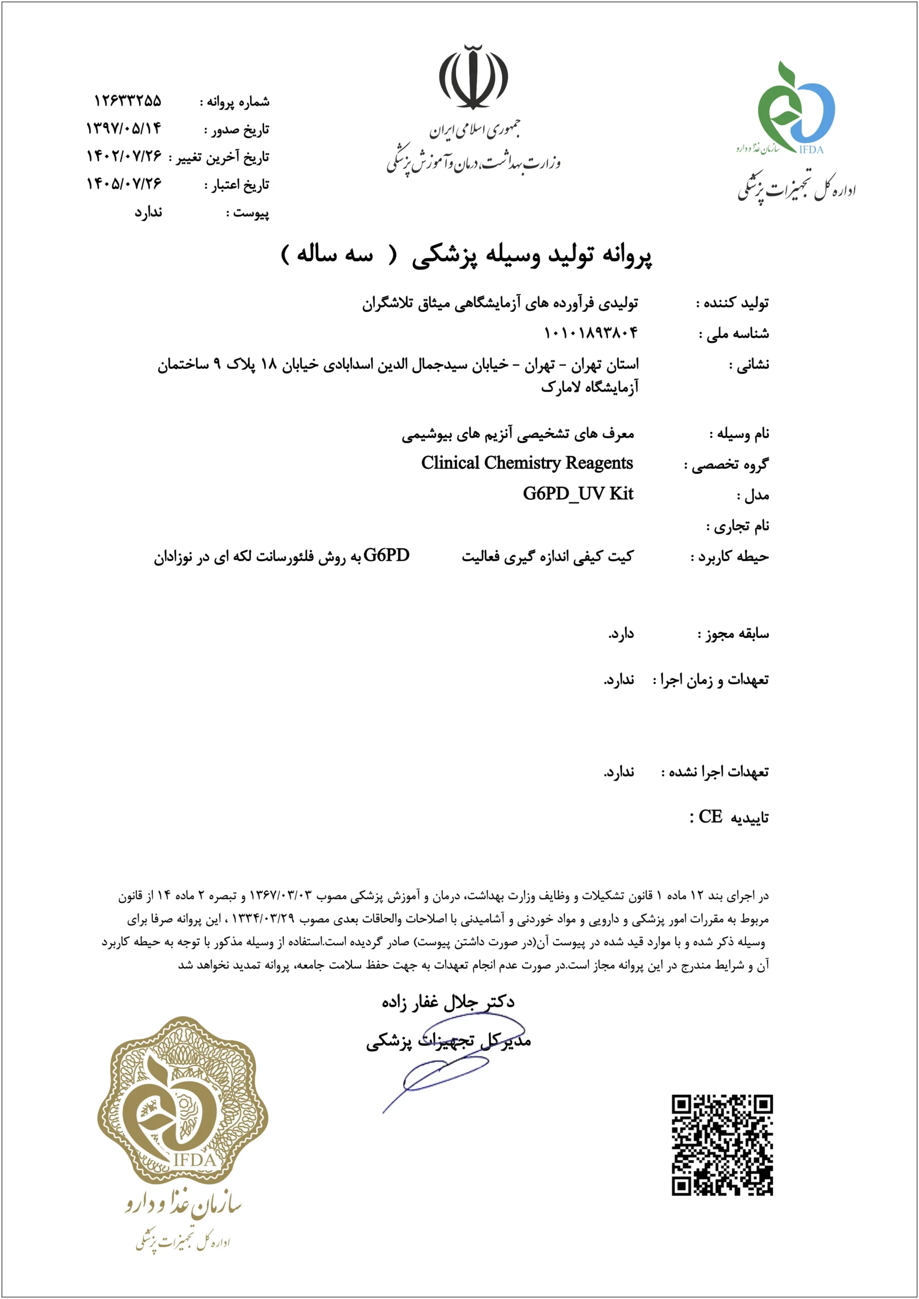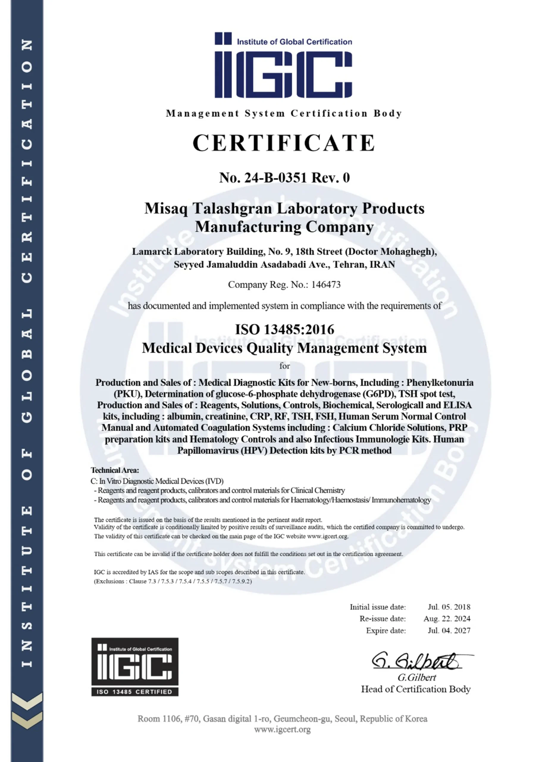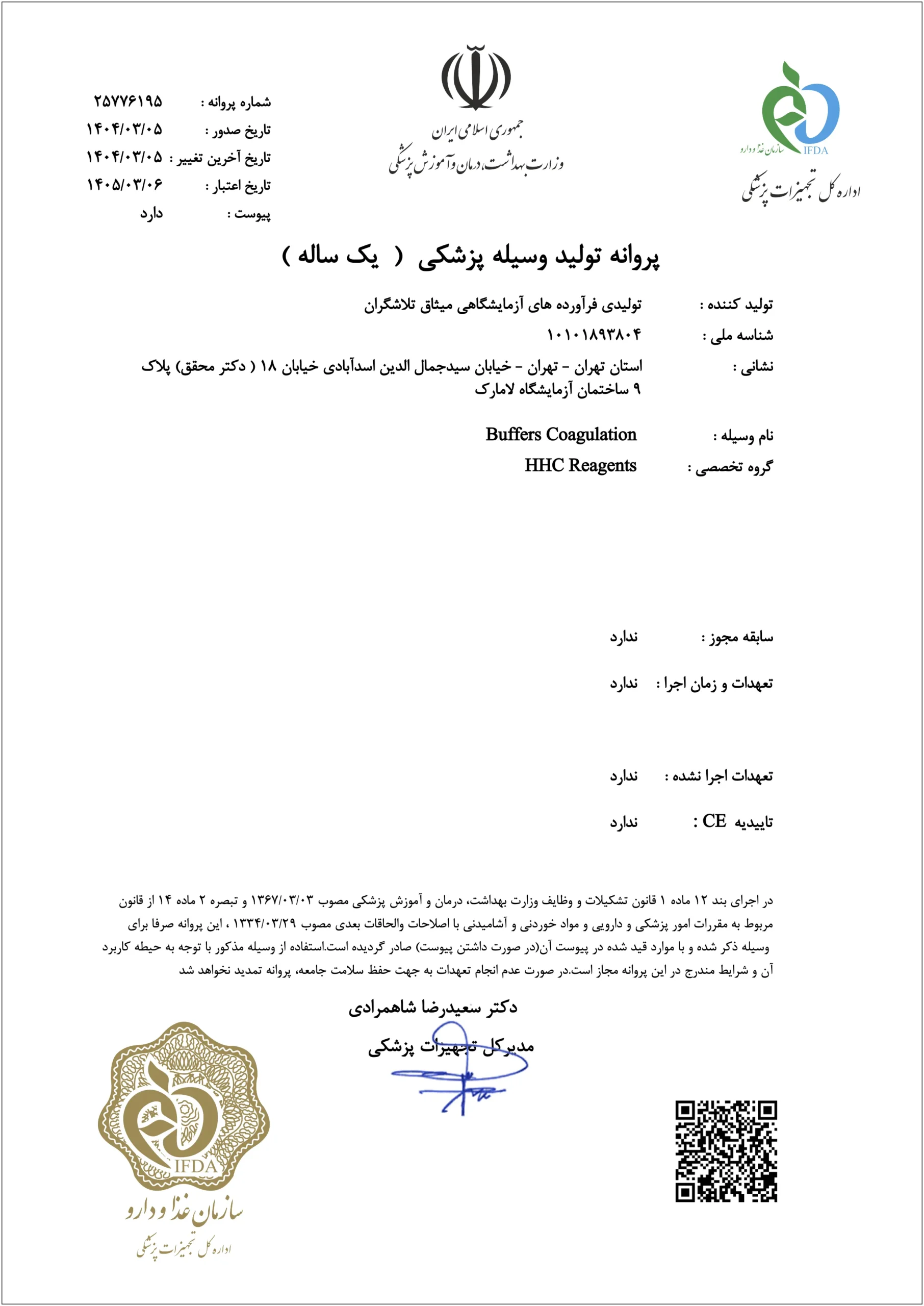 To date, all manufacturing processes have complied with Good Manufacturing Practice (GMP) standards and the requirements set forth by the Medical Equipment Department of the Food and Drug Administration (FDA) of Iran. The company holds ISO 13485 certification issued by the International Global Certification (IGC) body.